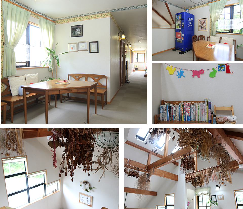 天井と吹き抜けが明るい印象のつばきもと館内。