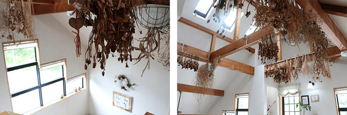 天井と吹き抜けが明るい印象のつばきもと館内。
