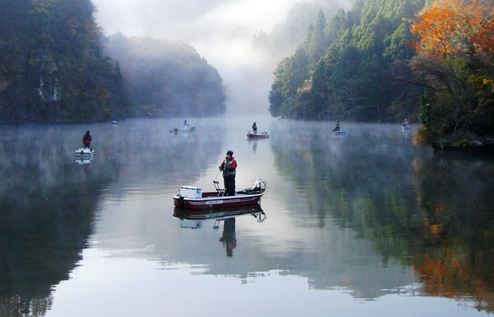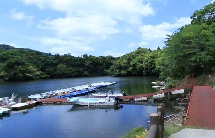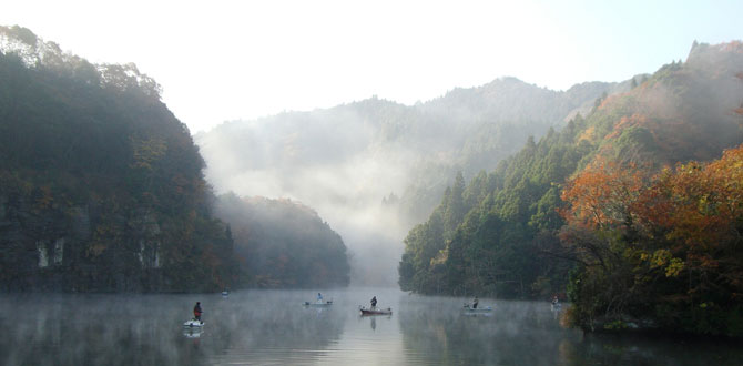 昭和56年に完成した人造湖で、複雑な地形のためたくさんの橋が架かっており、モーターボートクルーズやレンタルボートで回ると季節や時間によって刻々と変化する美しい景観を楽しめます。特に、11月下旬から12月上旬の「もみじ狩りクルーズ」がオススメです。また、50㎝以上の大物を狙えるとあって釣り人にも大人気!モーターボートクルーズやレンタルボートは、当館でも受け付けております。(要予約)