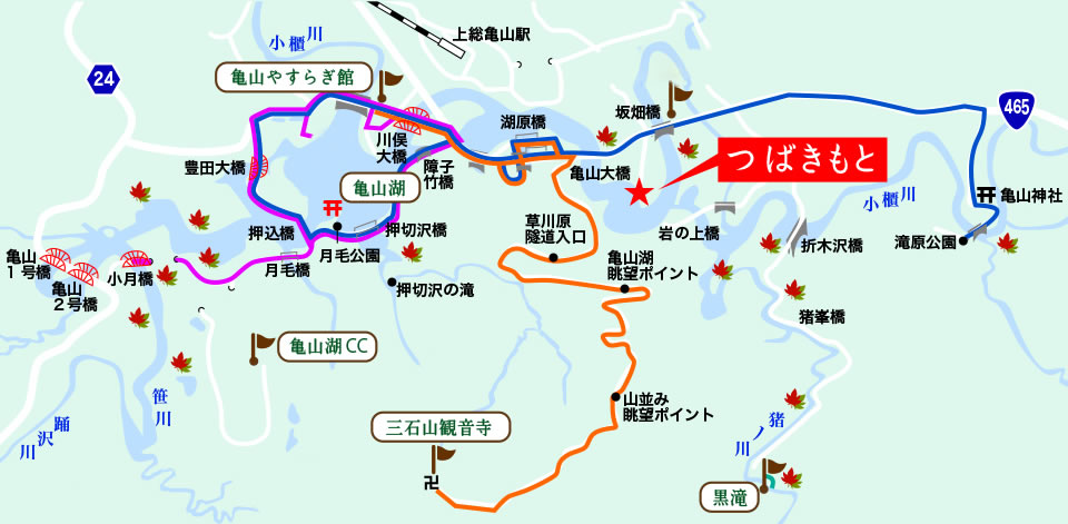 湖畔の宿つばきもとは、千葉県君津市の亀山地区、亀山湖を中心とする大きな森の大自然に囲まれた宿です。ここ亀山湖は釣り人に人気が高く、春夏秋冬各地から多くの釣り客が訪れます。また、亀山湖カントリークラブ、三石観音寺、黒滝、清澄寺、亀山神社などのスポットをめぐるさまざまなハイキングコースもあります。
